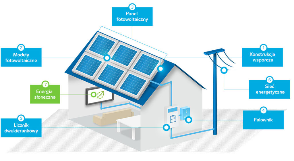 Panele fotowoltaiczne zamontowane na dachu bądź gruncie, za pomocą swoich właściwości są w stanie zamienić padające na nie promienie słoneczne w prąd stały. Przesyłany jest on do inwertera, który zmienia go w prąd zmienny. Tym sposobem zasila on wszystkie urządzenia elektryczne. Nadwyżki energii trafiają do sieci publicznej. Wyprodukowany i przesłany przez nas jego nadmiar będziemy mogli odebrać, gdy prąd z własnej elektrowni przestanie wystarczać na bieżące potrzeb